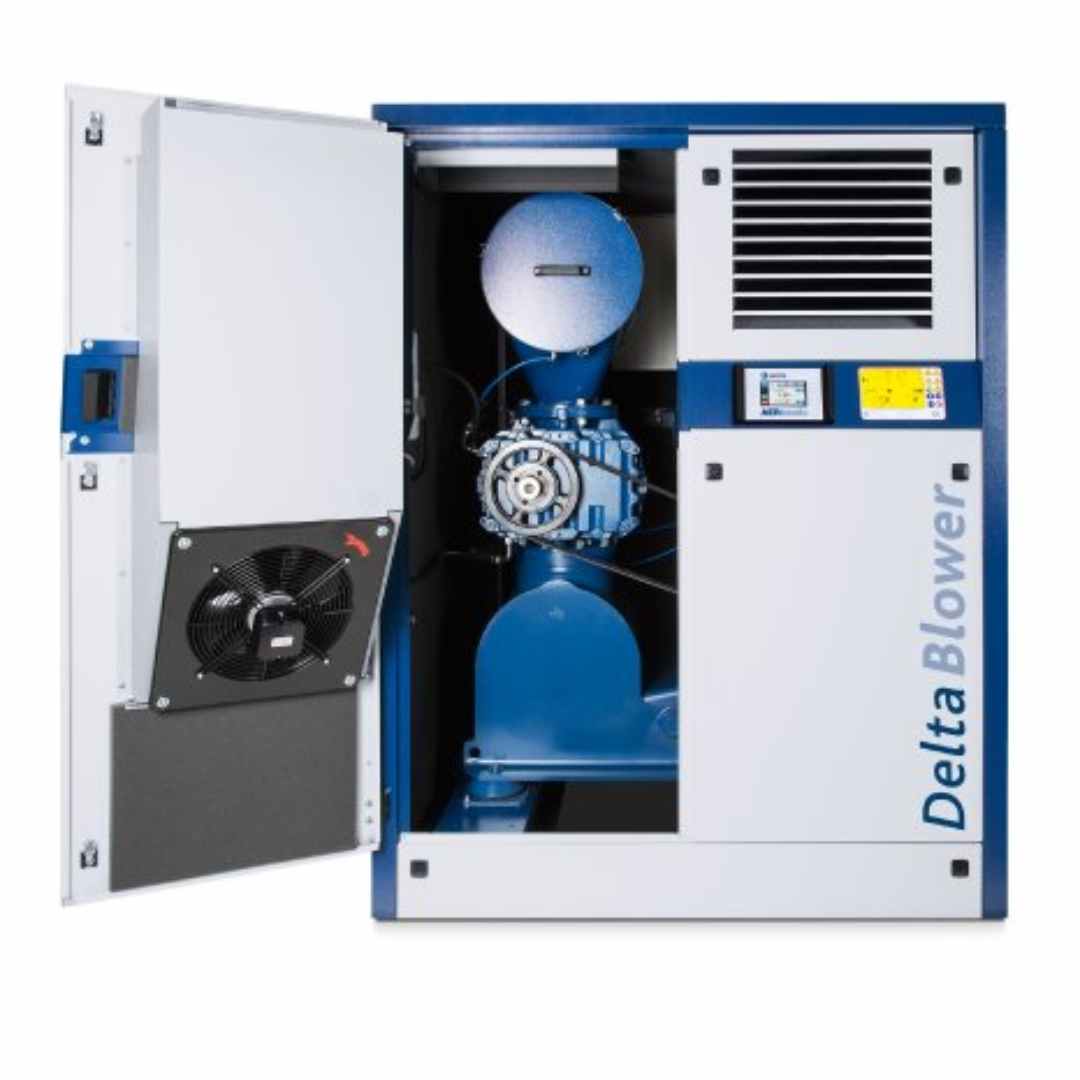 • Key Advantages: Significant energy savings (often 15-30% over PD blowers in optimal ranges), good turndown capabilities (ability to efficiently vary output), oil-free air delivery, and suitability for pressure applications typically up to 1.5 bar (g) or higher for specific designs. Aerzen’s Delta Screw series is known for its optimized rotor profiles and efficient cooling systems.