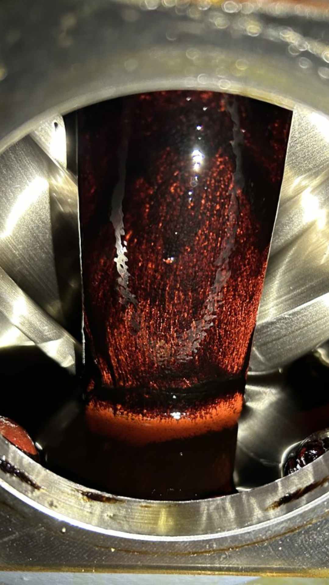 As these molecules shear and oxidize, they become unstable and begin to polymerize—linking together to form larger, insoluble compounds. These compounds are no longer carried in suspension by the lubricant. They begin to drop out and adhere to surfaces, especially hot metal surfaces, where they “bake on” to form the familiar hard, sticky varnish deposit.